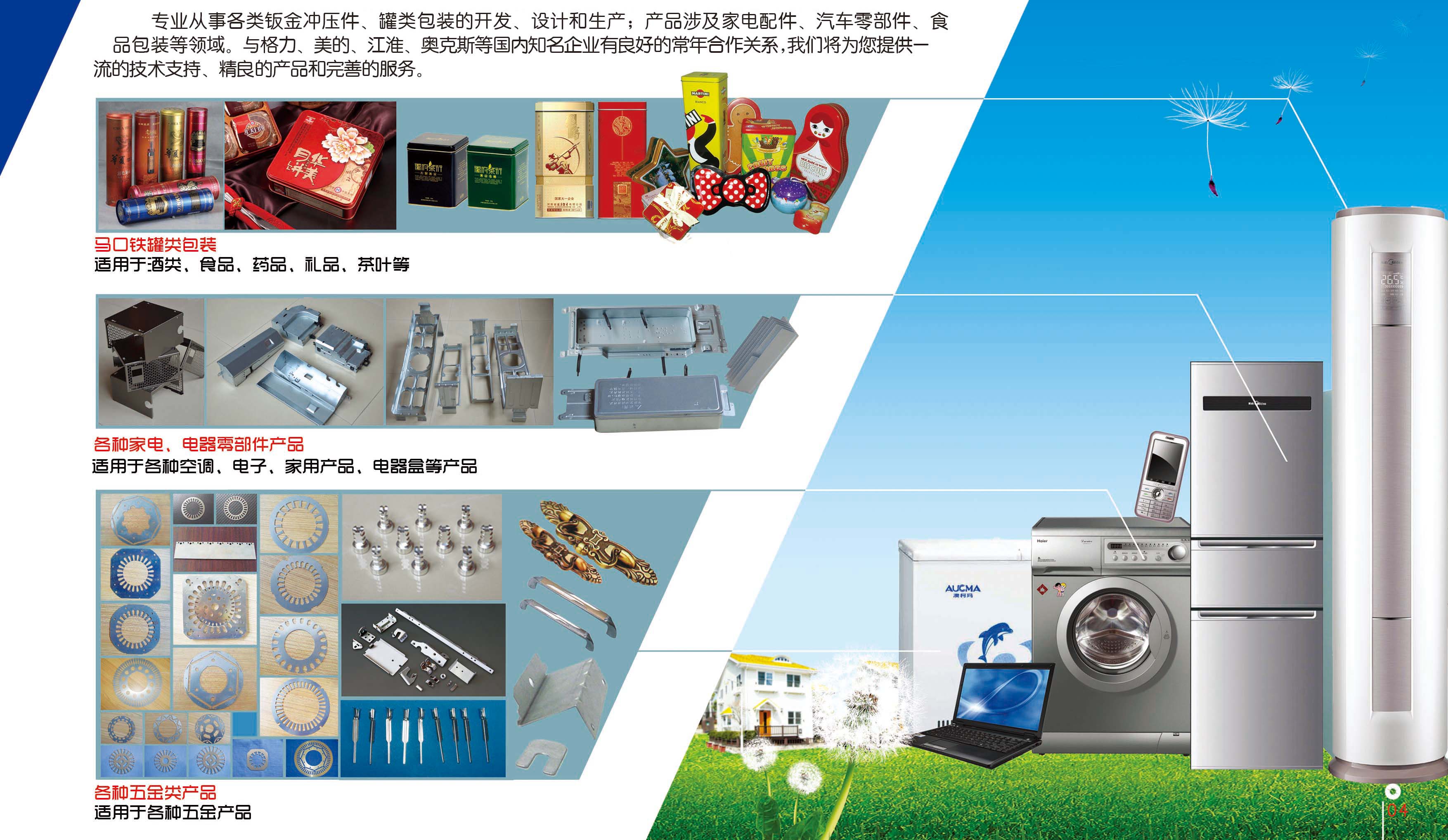 专业从事各类钣金冲压件、罐类包装的开发、设计和生产;产品涉及家电配件、汽车零部件、食品包装等领域。与格力、美的、江淮、奥克斯等